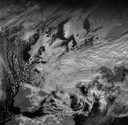 Tief 'Daisy' mit Zentrum über Norditalien sorgt für dichte Wolken von Frankreich bis Weißrussland. Über dem Ostatlantik und dem westlichen Mittelmeer hat sich in der von Norden eingeströmten Kaltluft lockere Schauerbewölkung gebildet. Nur wenig Bewölkung findet sich unter dem Einfluss von Hoch 'Bob' in Südskandinavien.