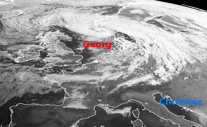 Das Tief 'Georg' liegt heute morgen mit seinem Zentrum vor Norwegen. Seine Wolken erstrecken sich von der nördlichen Nordsee über Süd-Skandinavien bis nach Polen und Süddeutschland. Es hat das Hoch 'Christine' weit nach Südosten verdrängt. Mit einer westlichen Strömung gelangt nun feuchte Luft nach Mitteleuropa, in der es zu Schauern kommt. (Bildquelle: NERC Satellite Receiving Station, Dundee University, Scotland, http://www.sat.dundee.ac.uk/)