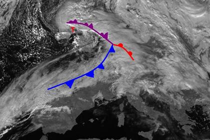 Auf dem Satellitenbild von Montag Mittag sind die Ausläufer von Tief 'Ingmar' bei Großbritannien gut zu erkennen. Sie sorgen heute für dichte Wolken und Regen von Großbritannien und Südskandinavien über Deutschland bis in den Norden von Spanien. Rund ums Mittelmeer ist es unter leichtem Hochdruckeinfluss eher freundlich und trocken.