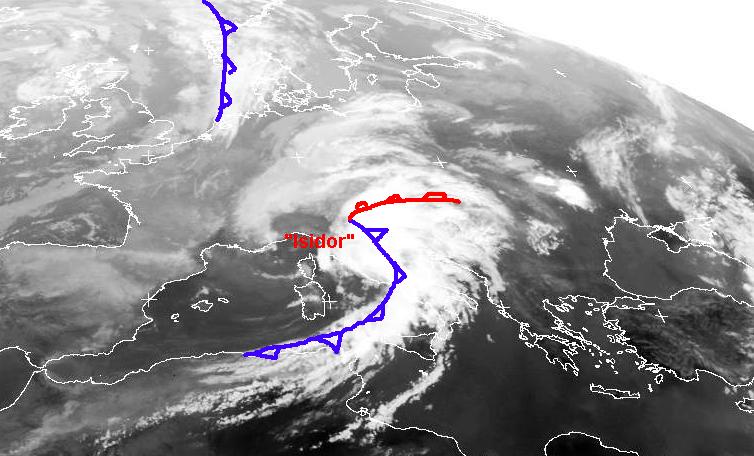Auf dem Satellitenbild von Mittwoch früh erkennt man ein Tief ('Isidor') über Italien. Seine Fronten reichen von Norditalien bis auf den Balkan (Warmfront) und über das Mittelmeer hinweg bis nach Nordafrika (Kaltfront). Das Tief zieht heute weiter Richtung Osten und sorgt zwischen der Adria und dem Schwarzen Meer für Regen, zum Teil auch für Gewitter. Im Norden über der Nordsee liegt die Kaltfront des Tiefs 'ex-Franklin'. Sie erreicht im Laufe des Tages auch Deutschland und bringt Schauer mit.
