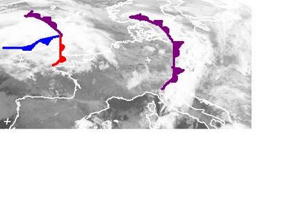 Von Südskandinavien über Polen bis nach Nordspanien erstreckt sich die Okklusionsfront von Tief 'Karin' und sorgt für Wolken und Regen. Die dichten Wolken über Großbritannien bringen bereits ein neues Tief ('Louisa) nach Europa. Seine Warmfront wird heute noch Deutschland erreichen und neuen Regen mitbringen. (Bildquelle: NERC Satellite Receiving Station, Dundee University, Scotland, http://www.sat.dundee.ac.uk/)
