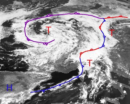 Tief 'Mattea' mit seinem Zentrum über der Nordsee bringt heute viele Wolken über Europa. Im Osten haben sich dabei zwei Randtiefs gebildet. Über Deutschland erkennt man zwischen den Tiefausläufern eine Zone geringerer Bewölkung, in der es heute teils zu Auflockerungen kam. Von Westen ziehen aber auch schon die neuen Wolken des Tiefs mit Schauern und vereinzelten Gewittern nach Deutschland. (Bildquelle: Copyrigt EUMETSAT, NERC Satellite Receiving Station, University of Dundee)