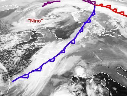 Über der Nordsee, zwischen Schottland und Südnorwegen, ist das Tief 'Nino' gut zu erkennen. Seine Fronten erstrecken sich von Südskandinavien bis nach Spanien und sorgen hier örtlich für Regen. In der, relativ zum Wasser, kalten Luftmasse, die hinter der Kaltfront einströmt bilden sich auf dem Atlantik örtlich Schauer, die westlich von Frankreich und Großbritannien gut zu erkennen sind.