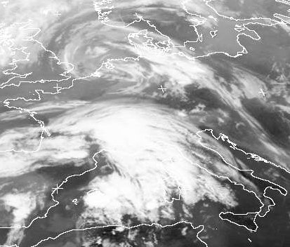 Tief 'Ortrun' findet man im Zentrum der Wolkenspirale über Norddeutschland und der Nordsee. Unter den über Ostniedersachsen und Mecklenburg-Vorpommern ist es schon am Morgen zu teils kräftigen Gewittern gekommen. Auch am Nachmittag entstehen unter 'Ortruns' Einfluss vielerorts in Deutschland Schauer und teils kräftige Gewitter. Von Westen lenkt das Tief jedoch kühlere und trockenere Luft nach Deutschland. Ein weiteres Tief über den Pyrenäen bedeckt mit einem Wolkenschirm weite Teile des westlichen Mittelmeers. Zu Gewittern kommt es aber heute vorwiegend über dem Land. (Bildquelle: NERC Satellite Receiving Station, Dundee University, Scotland, http://www.sat.dundee.ac.uk/)