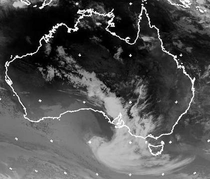 Über den meisten Teilen Australiens gibt es derzeit nur wenige Wolken, vor allem in Küstennähe sind einige Schauerwolken zu finden. Südlich des Kontinents liegt jedoch ein Tief, dessen Kaltfrontbewölkung weit ins Landesinnere gezogen ist. An der Südküste Westaustraliens folgt in kühlerer Luft flachere Bewölkung, die am leichten Grauton zu erkennen ist.