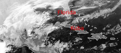 Der Golf von Mexiko liegt am Dienstag Mittag vor allem im Westen unter dichten Wolken. Die Wolken erreichen dabei teils auch Mexiko und Texas, hier kommt es zu Regenfällen und teils ist es auch windig. Weiter nach Osten werden die Wolken immer weniger. Auf den Karibischen Inseln herrscht von Kuba bis Puerto Rico meist sonniges und trockenes Wetter. Das Tief zieht in den nächsten Tagen voraussichtlich nach Nordosten weiter und überquert dabei Florida. (Bildquelle: NERC Satellite Receiving Station, Dundee University, Scotland, http://www.sat.dundee.ac.uk/)