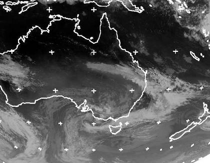 Über dem westlichen Victoria liegt das Zentrum eines Tiefs. Das Wolkenband seines Frontensystems erstreckt sich über die Bass-Straße und die Tasmansee bis nach Queensland. Dort regnet es auch. Von Südwesten zieht in kühl-feuchter Luft aber auch SChauerbewölkung auf die Rückseite des Wolkenbands.