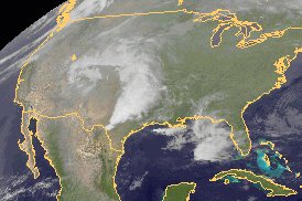 Über weiten Teilen des Ostens der USA findet man unter Hochdruckeinfluss keine Wolken. Über dem Westen baut sich dagegen ein Tiefdruckwirbel auf, der allmählich ostwärts zieht. Dabei kommt es zu teils kräftigem Regen.