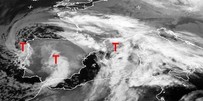 Auf dem Satellitenbild von Sonntag früh ist über der Iberischen Halbinsel ein Tiefdrucksystem aus drei Tiefdruckgebieten gut zu erkennen. Es bringt heute vor allem Regen und Schnee in Frankreich, aber auch in Spanien und Portugal, sowie von Nordafrika bis nach Italien. In den nächsten Tagen wird sich das System weiter nach Süden verlagen, so dass die Niederschläge über dem Europäischen Festland abklingen.