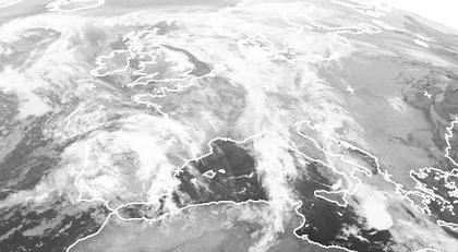 Das Tief 'Ulrike' befindet sich zur Zeit über den Britischen Inseln und bestimmt hauptsächlich das Wetter in Westeuropa mit Wolken und Regen. Seine Fronten reichen von der Nordsee über Deutschland und der Schweiz bis ins Mittelmeer. Südlich von Island kündigt sich das nächste Tief an, dass weiterhin für wechselhaftes Wetter sorgt. (Bildquelle: NERC Satellite Receiving Station, Dundee University, Scotland, http://www.sat.dundee.ac.uk/)