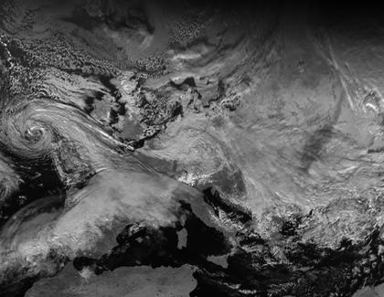 Auf dem Satellitenbild ist vor der Westeuropäischen Atlantikküste ein gut ausgeprägtes Tiefdruckgebiet zu erkennen. Sehr gut zeigt sich die spiralförmige Struktur sowie die typische Bewölkung es Kaltluft- und des Warmluftbereichs.