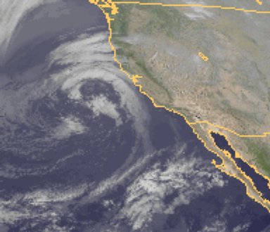 Auf dem Pazifik vor der Küste Kaliforniens erkennt man einen Tiefdruckwirbel. Seine Kaltfront mit Regen zieht nun langsam auf den Kontinent, wo derzeit noch nur wenige Wolken zu finden sind.