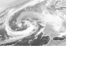 Auf dem Satellitenbild von Dienstag früh ist ein Tief auf dem Atlantik, westlich von Portugal mit seinen Fronten gut zu erkennen. Die Wolken seiner Warmfront sorgen vor allem im Norden von Spanien örtlich für Regen. (Bildquelle: NERC Satellite Receiving Station, Dundee University, Scotland, http://www.sat.dundee.ac.uk/)