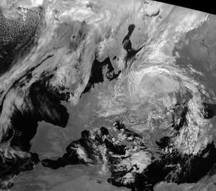 Auf dem Satellitenbild ist deutlich die spiralförmige Struktur des Tiefdruckgebietes 'Wimar' über dem östlichen Mitteleuropa zu erkennen. Spanien und große Teile Frankreichs liegen hingegen im Einflußbereich von Hoch 'Vanessa' mit Zentrum über dem Ärmelkanal.