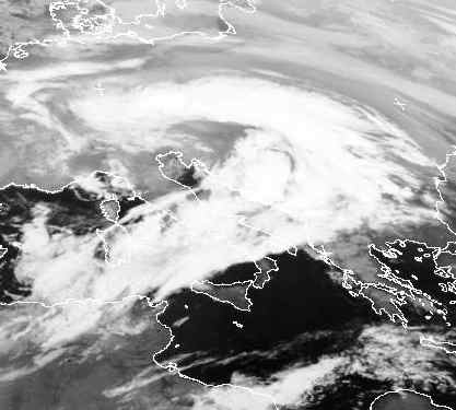 Der Ausschnitt zeigt das Tief 'Yannick' mit Kern über den Alpen. Seine Okklusionfront erstreckt sich spitalförmig vom Zentrum des Tiefs bis zum Dinarischen Gebirge, die Warmfront liegt über dem Balkan und die Kaltfront reicht bis nach Nordafrika. Der große Temperaturunterschied zwischen dem warmen Wasser des Mittelmeers und der kalten Luft sorgt für hohe Labilität, als Folge entwickeln sich zum Teil kräftige Schauer in der Region. Solange die kalte Luftmasse wetterbestimmend bleibt muss hier weiterhin mit mit häufigen Schauern gerechnet werden.