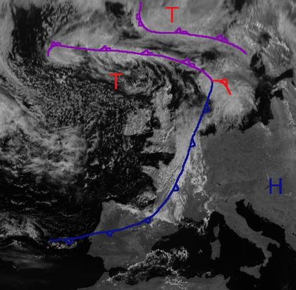 Tief 'Yves' mit Zentrum über dem Atlantik sorgt heute für einige dichte Wolken von Island über Südskandinavien bis in den Norden Spaniens. Dabei kommt es häufig zu Schauern und Gewittern. Nach Osten hin ist es dagegen unter dem Einfluss von Hoch 'Helga' meist wolkenarm. Allerdings zieht die Kaltfront von Tief 'Yves' rasch nach Osten weiter und drängt das Hoch nach Osten ab, dabei ziehen ab dem späten Nachmittag Schauer und Gewitter auch über Deutschland hinweg.