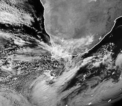 Während es sonst im südlichen Afrika derzeit trocken und verbreitet wolkenlos ist, wird der äußerste Süden immer wieder von Tiefausläufern gestreift. Sie bringen teils auch Regen und kühle Luft mit. Örtlich liegen die Höchstwerte nur bei 12 Grad.