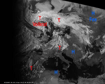 Auf dem Satellitenbild von heute Vormittag zeigt sich Tiefdruckeinfluss von den Britischen Inseln, über Skandinavien bis nach Westrussland und desweiteren über Teilen Mitteleuropas. Hierbei herrscht überwiegend wechselhaftes Wetter mit Schauern und einzelnen Gewittern vor. Weiter nach Süden und Südosten dominiert dagegen Hochdruckeinfluss mit weitgehend heiterem und trockenem Wetter vor. Nur ein schwacher Tiefausläufer über Portugal kann dort für einzelne Schauer oder Gewitter sorgen.