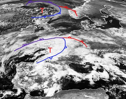 Zwei Tiefdruckgebiete bringen über der Nordsee und Teilen von Skandinavien sowie von der Iberischen Halbinsel bis nach Frankreich am Donnerstag Mittag dichte Wolken und gebietsweise Regen. Über der Mitte der Britischen Inseln bis nach Deutschland und Polen befindet sich eine Zone geringerer Bewölkung, hier sorgt Hoch 'Gerulf' über Ungarn für Zwischenhocheinfluss und teils freundliches Wetter. Das südliche der beiden Tiefdruckgebiete, Tief 'Dana' mit Zentrum über Frankeich, wandert nun nach Osten weiter und überquert dabei auch die Mitte und den Süden Deutschlands. (Bildquelle: NERC Satellite Receiving Station, Dundee University, Scotland, http://www.sat.dundee.ac.uk/)