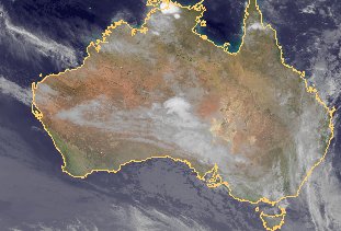 Auf dem heutigen Satellitenbild von Australien sind ausgestrecke Wolkenbänder über Teilen vom Osten und vom Süden Australiens zu erkennen. Hierbei sorgen Tiefdrucksysteme für zeitweiligen Regen. Im weitaus größten Teil Australiens herrscht dagegen heiteres und auch trockenes Wetter.