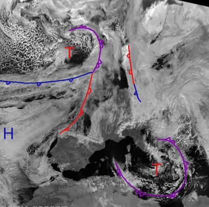 Während sich heute Mittag über dem zentralen Mittelmeer die Bewölkung von Tief 'Berthold' befindet, liegt von den Ostalpen ausgehend starke Bewölkung bis nach Skandinavien und Russland. Sie gehört zu dem Tief 'Andreas'. Bei Island zeigt sich schon das nächste Tief 'Caesar' mit seinen Wolken. Dagegen konnte sich vom westlichen Mittelmeer bis nach Westdeutschland eine Zone geringerer Bewölkung etablieren, da es hier zu schwachem Zwischenhocheinfluss kam. Ebenso herrscht auf dem Atlantik Hochdruck vor, hier ziehen allerdings viele hochnebelartige Wolken durch.