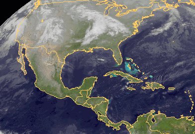 Über den USA erkennt man drei Tiefdruckgebiete, die von West nach Ost über das Land wandern: Eins im Mittleren Westen, eins über den Rocky Mountains und eins an der Westküste. Weiter nach Süden ist es dagegen über Mittelamerika und der Karibik bis in den Norden von Venezuela wolkenarm und weitgehend trocken.