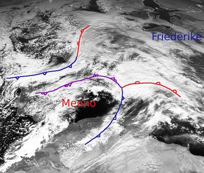 Das Satellitenbild von heute Mittag zeigt zwei Tiefdruckgebiete, die für reichlich Wolken über Europa sorgen. Tief 'Menno' über dem Mittelmeer bringt dabei südlich der Alpen viel Schnee und Regen, nördlich davon kommt es durch die Südanströmung teils zu Föhn in Süddeutschland mit Temperaturen bis 11 Grad. Im Osten dagegen bringt Hoch 'Friederike' teils Sonne, teils aber auch Hochnebel. Bis zum Wochenende bleibt das Tief über den Britischen Inseln erhalten, sodass auf seiner Vorderseite von Südwesten mildere Luft nach Deutschland strömt. (Bildquelle: Copyrigt EUMETSAT, NERC Satellite Receiving Station, University of Dundee)