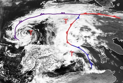 Ein umfangreiches Tiefdrucksystem mit drei Zentren liegt mit seinen dichten Wolken am Dienstag Mittag über West- und Mitteleuropa. Es bringt häufig Regen, teils auch Schauer und Gewitter. Auch über der Iberischen Halbinsel und dem nördlichen afrikanischen Kontinent zeigen sich zahlreiche Schauer- und Gewitterzellen. Östlich des Systems strömt hinter der Warmfront, die quer über Norddeutschland liegt, feucht-warme Luft von Süden nach Norden. Sie sorgt am Mittwoch für schwüles Wetter in Deutschland, teils können sich dann in ihr Gewitter bilden. (Bildquelle: Copyrigt EUMETSAT, NERC Satellite Receiving Station, University of Dundee)