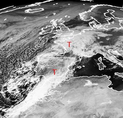 Eine Tiefdruckrinne erstreckt sich von Frankreich bis nach Marokko. Auf ihrer Westseite strömt über dem Atlantik Kaltluft nach Süden, in der sich Schauer und nach Süden hin teils auch Gewitter bilden. In Marokko kommt es zu ergiebigen Regenfällen. Weiter östlich strömt mildere Luft nordwärts nach Deutschland. Der Westen und Norden ist hier unter dem Tiefdruckeinfluss durch dichte Bewölkung geprägt. Weiter nach Südosten scheint häufiger die Sonne, über Sachsen und Thüringen erkennt man jedoch ein ausgedehntes Nebelgebiet. Da die von Süden heranströmende Luft nicht nur mild, sondern auch feucht ist, bleibt an den kommenden Tagen in Deutschland eine Tendenz zu teils nebeligem Wetter bestehen.