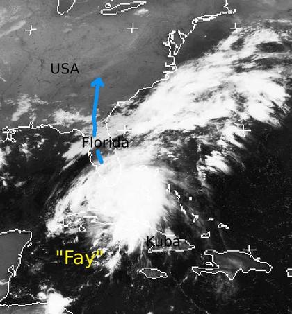 Der Tropensturm 'Fay' ist mit seinen Wolken heute über Florida angekommen. Die Windgeschwindigkeiten liegen bei 72 km/h im Mittel und 83 km/h in Böen. Während der Wind also nicht allzu stark ist, fällt aus den kompakten Wolken aber sehr ergiebiger Regen. 'Fay' zieht nun unter Abschwächung nach Norden ins Landesinnere weiter. (Bildquelle: Copyrigt EUMETSAT, NERC Satellite Receiving Station, University of Dundee)