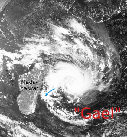 Der Tropensturm 'Gael' im Indischen Ozean, dessen imposantes Wolkenfeld sich hier im Satellitenbild offenbart, hat sich heute weiter auf Madagaskar zubewegt. Seine Ausläufer haben dabei die Inseln Mauritius und Reunion erfasst. 'Gael' bringt es auf Windgeschwindigkeiten von 100 km/h im Mittel und 150 km/h in der Spitze. Der Tropensturm bewegt sich nun etwas in südwestliche Richtung weiter und wird zum Wochenende unter weiterer Verstärkung voraussichtlich Madagaskar erreichen. (Bildquelle: NERC Satellite Receiving Station, Dundee University, Scotland, http://www.sat.dundee.ac.uk/)