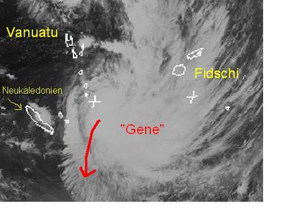 Im Südpazifik befindet sich der Tropensturm 'Gene' derzeit über den südlichen Inseln von Vanuatu. Zurzeit erreicht er mittlere Windgeschwindigkeiten von 167, in Böen 204 km/h. Berechnungen zufolge soll er sich jedoch langsam Abschwächen und Richtung Süden ziehen. Dennoch wird Neukaledonien von seinen Ausläufern gestreift werden. (Bildquelle: NERC Satellite Receiving Station, Dundee University, Scotland, http://www.sat.dundee.ac.uk/)