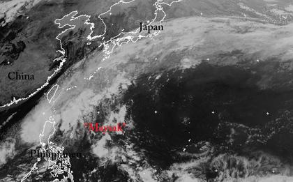 Der Tropensturm 'Maysak', der bei Windgeschwindigkeiten um 50 km/h mittlerweile nur noch eine tropische Störung darstellt, liegt heute im Südchinesischem Meer zwischen den Philippinen und Taiwan. Während der Wind also schon recht schwach ist, zieht sich ausgehend von dem Tropensturm eine langes Wolkenband bis weit auf dem Pazifik hinaus. In diesem Bereich kommt es zu teils kräftigen Niederschlägen. (Bildquelle: Copyrigt EUMETSAT, NERC Satellite Receiving Station, University of Dundee)