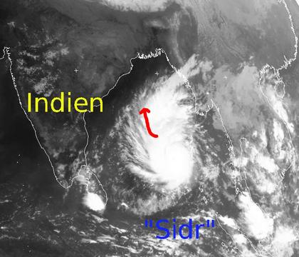 Über dem Golf von Bengalen hat sich östlich von Indien der Tropensturm 'Sidr' aufgewirbelt. Derzeit liegt seine mittlere Windgeschwindigkeit bei 100 km/h, in Böen werden bis 150 km/h erreicht. Er zieht nun voraussichtlich langsam in nördliche Richtung weiter und wird sich zu einem Zyklon verstärken. (Bildquelle: NERC Satellite Receiving Station, Dundee University, Scotland, http://www.sat.dundee.ac.uk/)