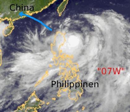 Über den Philippinen liegt ein Tropensturm mit den Codenamen '07W'. Er weist mittlere Windgeschwindigkeiten von 65 km/h auf, in Böen werden 85 km/h erreicht. Während der Wind also nicht all zu heftig ist, kommt es unter den Wolken aber zu ergiebigen Niederschlägen, vor allem im Norden des Landes, wo teilweise 100 Liter und mehr auf den Quadratmeter fallen. Der Tropensturm zieht langsam auf die chinesische Küste und auch Hongkong zu, schwächt sich dabei aber ab.
