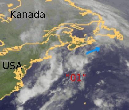 Auf dem Satellitenbild zeigt sich heute Mittag die tropische Störung mit dem Codenamen '01' mit ihren Wolken vor den USA. Dieses Tief ist mit Windgeschwindigkeiten von 60 km/h noch sehr schwach, weist aber schon die Charakteristiken eines Wirbelsturms auf. Offiziell beginnt die Hurrikansaison im Atlantik am 01. Juni und dauert bis zum 30. November. Berechnungen zufolgen werden diese Saison etwa 12 Tropenstürme erwartet, wovon sich 6 zum Hurrikan ausbilden und 2 davon die Kategorie 3 oder höher erreichen.