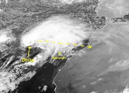 Der Ausschnitt zeigt den tropischen Sturm „Delta“, er überquert heute die kanarische Inseln von West nach Oste und trifft am Dienstag mit Windgeschwindigkeiten von etwa 75 km/h auf die marokkanische Küste, er sorgt hier für ergiebigen Regen; auch in Algerien kommt es am Dienstag und Mittwoch zu teils kräftigen Regenfällen.