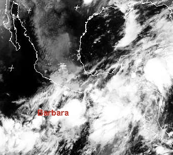 Südlich der Pazifikküste von Mexiko liegt der neue tropische Sturm 'Barbara' mit mittleren Windgeschwindigkeiten bis 75 km/h und Böen bis 95 km/. Er verstärkt sich weiter und erreicht möglicherweise Hurrikanstärke. Dabei zieht er nach Norden auf die Küste zu. (Bildquelle: NERC Satellite Receiving Station, Dundee University, Scotland, http://www.sat.dundee.ac.uk/)