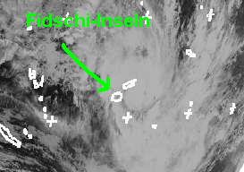 Über den Fidschi-Inseln im Südpazifik hat sich ein tropischer Sturm aufgewirbelt. Derzeit erreicht er mittlere Windgeschwindigkeiten von 65, in Böen 84 km/h. Berechnungen zufolge soll er sich weiter nach Süden verlagern und dabei noch etwas verstärken. Sein Endziel ist noch unklar. (Bildquelle: NERC Satellite Receiving Station, Dundee University, Scotland, http://www.sat.dundee.ac.uk/)