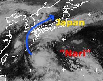 Vor den Nansei-Inseln südlich von Japan hat sich der neue Tropensturm 'Nari' formiert. Derzeit erreicht er mittlere Windgeschwindigkeiten von 85, in Böen bis 100 km/h. Er wird sich in den nächsten Tagen verstärken und könnte dann Böen bis 185 km/h bringen. Seine Zugbahn soll Berechnungen zufolge genau zwischen der koreanischen Halbinsel und Japan verlaufen. Die weitere Entwicklung bleibt aber noch abzuwarten. (Bildquelle: NERC Satellite Receiving Station, Dundee University, Scotland, http://www.sat.dundee.ac.uk/)