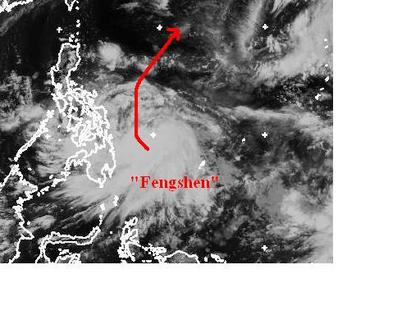 Südöstlich der Philippinen hat sich der tropische Sturm 'Fengshen' aufgewirbelt und bringt dabei auf den Inseln Sturm, sowie kräftige und ergiebige Regenfälle. Zurzeit erreicht er mittlere Windgeschwindigkeiten von 83, in Böen 102 km/h. Berechnungen zufolge soll er sich aber verstärken und Richtung Norden ziehen. Sein Endziel ist noch unklar. (Bildquelle: Copyrigt EUMETSAT, NERC Satellite Receiving Station, University of Dundee)