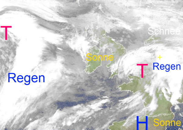Auf dem Atlantik ist bereits schon ein neuer Wolkenwirbel zu erkennen, auf dessen Vorderseite ein Hauch milder Vorfrühlingsluft in unser Land wegen wird, bevor sein Regengebiet uns am Donnerstag überqueren wird.