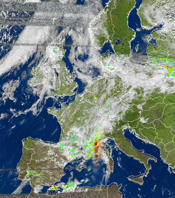 Auf dem Satellitenfoto von heute Nachmittag fällt vor allem das Gewittertief im nördlichen Mittelmeer ins Auge, hierbei ereigneten sich bereits vielfach kräftige Schauer und Gewitter mit Unwetterpotenzial. Weitere Schauer und Gewitter bildeten sich auch im Bereich der Iberischen Halbinsel, sowie in Teilen Osteuropas. Besonders sonnig und trocken ist es zur Zeit vom zentralen bis östlichen Mittelmeerraum, über dem Südosten Europas, sowie in Großteil Skandinaviens.