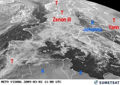 Auf dem heutigen Satellitenbild zeigt sich Europa verbreitet bewölkt oder bedeckt. Tief 'Zenon' mit Schwerpunkt über Südskandinavien, sorgt dort sowie auch im übrigen Skandinavien, in Deutschland und in weiten Teilen Mitteleuropas für gelegentlich etwas Regen, in Skandinavien und den Alpen auch für Schnee. Ein weiterer Tiefausläufer sorgt bei den Britischen Inseln besonders in Irland und Schottland für teils kräftige Schauer. Am freundlichsten bleibt es in weiten Teilen des Mittelmeerraums, wobei auch besonders an der spanischen und italienischen Küste häufig Schauer zu erwarten sind. Sonst bleibt es aber auch vielfach sonnig und trocken.