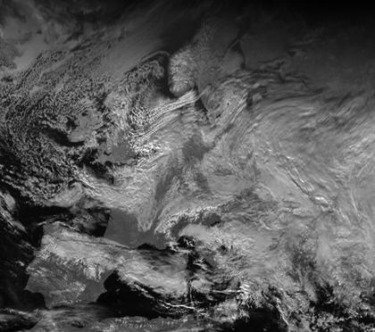 Über Europa liegen verbreitet viele Wolken. Meist sind sie in der kalten Luft unter Tiefdruckeinfluss entstanden. Es gibt aber auch einige Gebiete mit weniger Wolken, so etwa in der Mitte Deutschlands, in England und auf der Südseite der Alpen.
