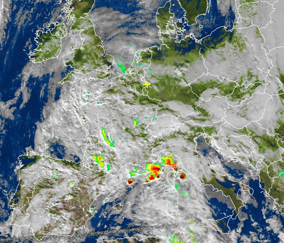 Das Satellitenfoto von heute Nachmittag zeigt Europa häufig wolkenverhangen, dabei war es zeitgleich über Deutschland häufig heiter oder sonnig. Jedoch sind hierbei zwei große Hochnebelfelder zu erkennen, eines über Süddeutschland und eines im Osten des Landes, die Wolken über Nord-NRW bzw. das südliche Niedersachsen zogen dagegen ostwärts ab.