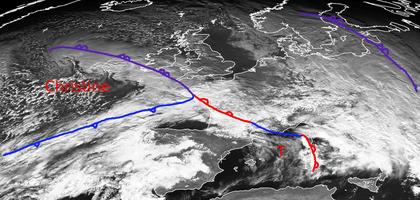 Die Ausläufer von Tief 'Birgitta' liegen am Sonntag Mittag schon im Osten Europas, sorgen aber noch bis nach Ostdeutschland für viele Wolken sowie Schnee und Regen. Weiter nach Westen gibt es eine wolkenfreie Zone, der sich Tief 'Christine' vor den Britischen Inseln anschließt. Im Mittelmeer hat sich ein Randtief gebildet und bringt auch hier einigen Niederschlag. 'Christine' wandert mit seinen Ausläufern heute Nacht nach Osten weiter und bringt neuen Regen, teils auch Schnee nach Mitteleuropa und auch Deutschland. (Bildquelle: NERC Satellite Receiving Station, Dundee University, Scotland, http://www.sat.dundee.ac.uk/)