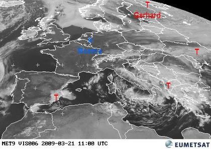 Auf dem heutigen Satellitenfoto ist Europa in einem breiten Bereich von der Iberischen Halbinsel, über Frankreich, bis nach England, über die Beneluxstaaten und bis Deutschland verbreitet wolkenlos. Dagegen sorgt ein Tiefdruckgebiet vom Westen Russlands, über Finnland, bis an die Westküste Norwegens für häufig dichte Bewölkung und einzelne Schauer, teils auch Schneeschauer. Ein weiteres Tiefdruckgebiet sorgt weiterhin am zentralen Mittelmeer zwischen Italien und Griechenland für teils dichte Wolken und häufige Schauer, teils auch für Gewitter.