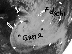 Der Tropensturm 'Gene' südwestlich der Fidschis im Südpazifik hat sich weiter abgeschwächt. Er weht aber zur Zeit immer noch mit mittleren Windgeschwindigkeiten um 130 km/h und erreicht in Böen Werte um 160 km/h.