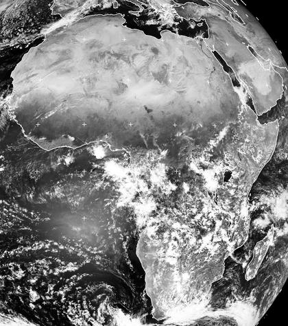 Auf dem Höhepunkt des Südsommers befinden sich die Wolken der tropischen Schauer und Gewitter über Afrika weitgehend nur in der Südhälfte des Kontinents. Dort treten sie aber verbreitet auf, bis in den äußersten Süden. Im Norden bleibt es weitgehend wolkenfrei. Erst die Küste Marokkos wird wieder von den Wolken der Kaltfront von Tief 'Ilse' gestreift. (Bildquelle: NERC Satellite Receiving Station, Dundee University, Scotland, http://www.sat.dundee.ac.uk/)